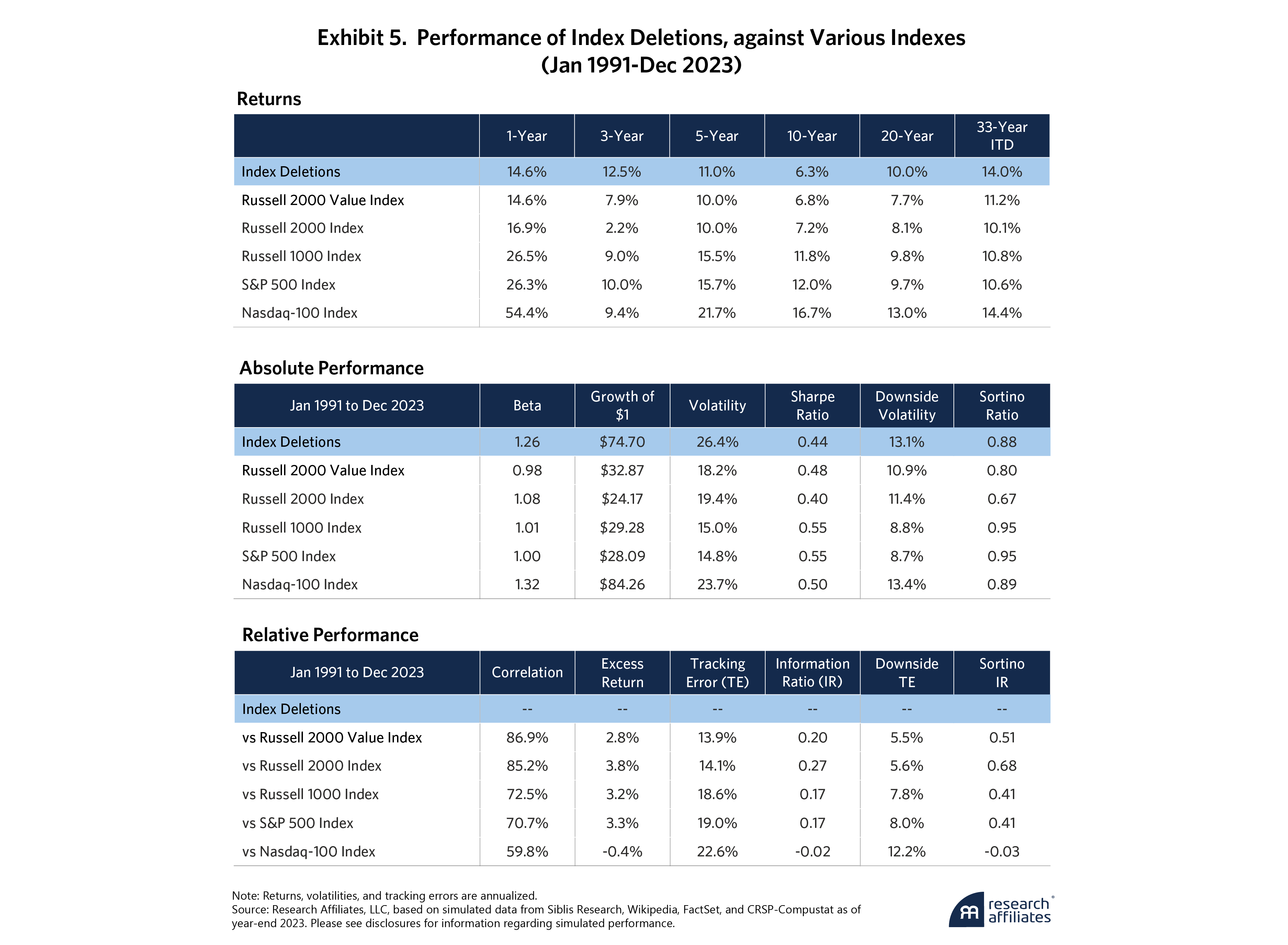 Exhibit 3 also shows that the S&P 500’s performance is nearly identical to the Russell 1000’s, with the Nasdaq-100 following a more tumultuous trajectory. Because this is on a log scale, if one line is rising faster than another, that index is winning. Absent fees, taxes, spending, and other charges, an investor in a broad deletions portfolio for the five post-deletion years would be 74-times wealthier at year-end 2023 than in January 1991. Only a Nasdaq-100 investor would fare as well, albeit with higher volatility and the harrowing drawdown of the dot-com crash. After 30-plus years, S&P 500, Russell 1000, and Russell 2000 Value investors would be 55% to 65% poorer than our brave deletions investor.