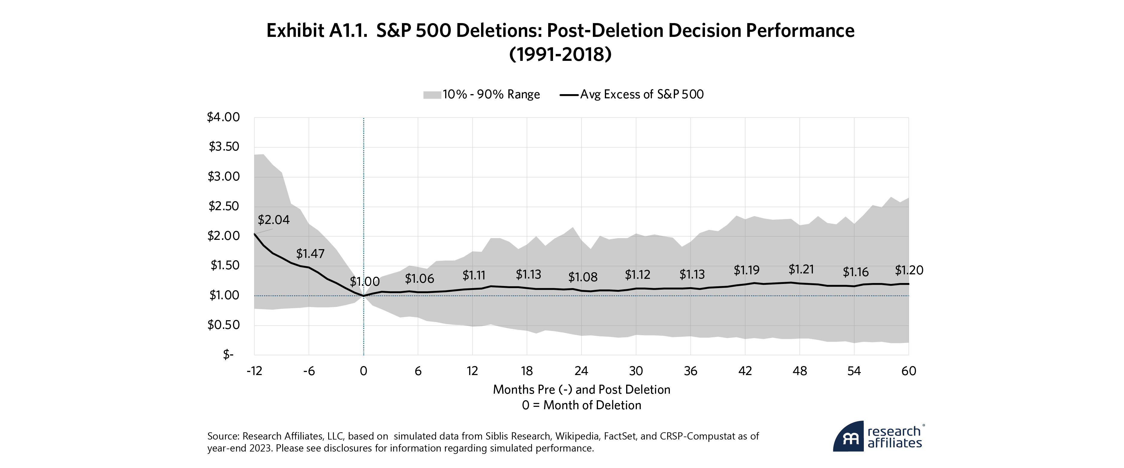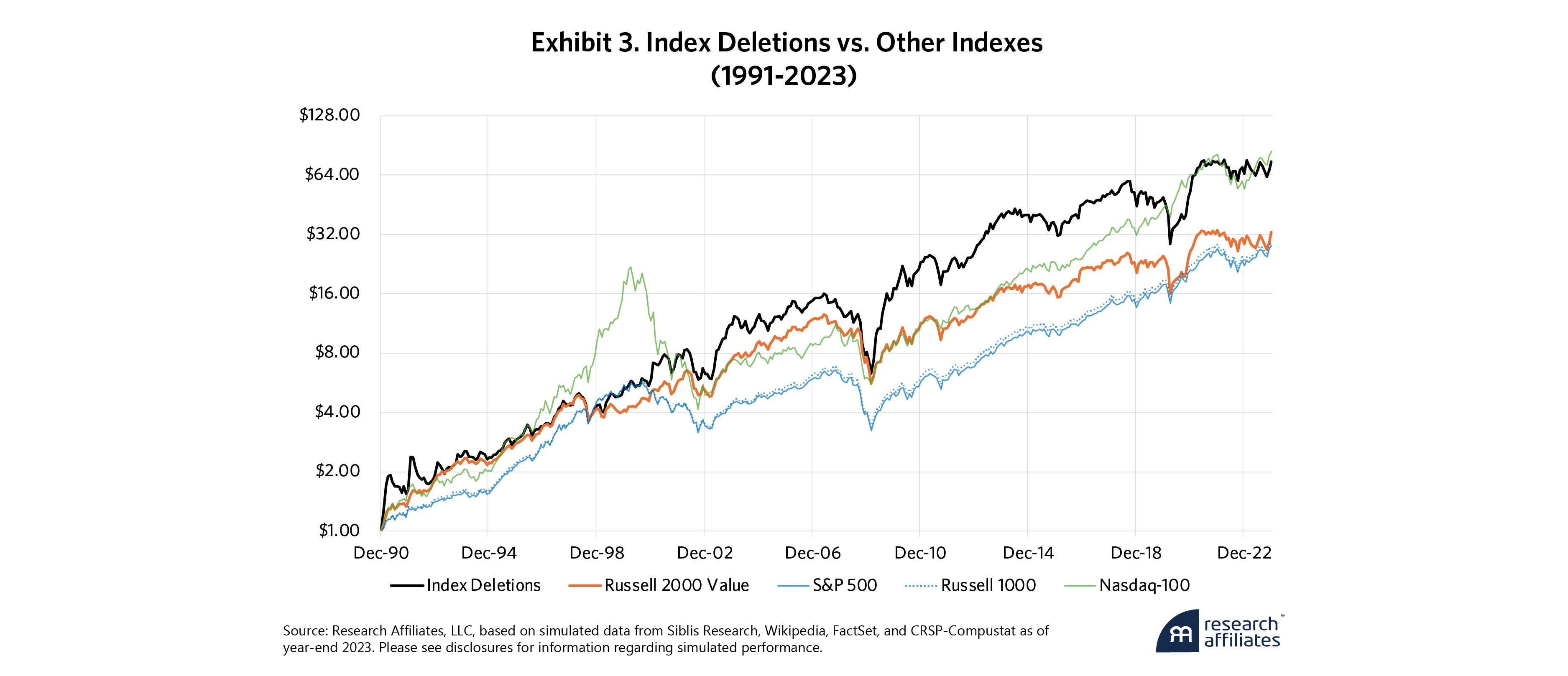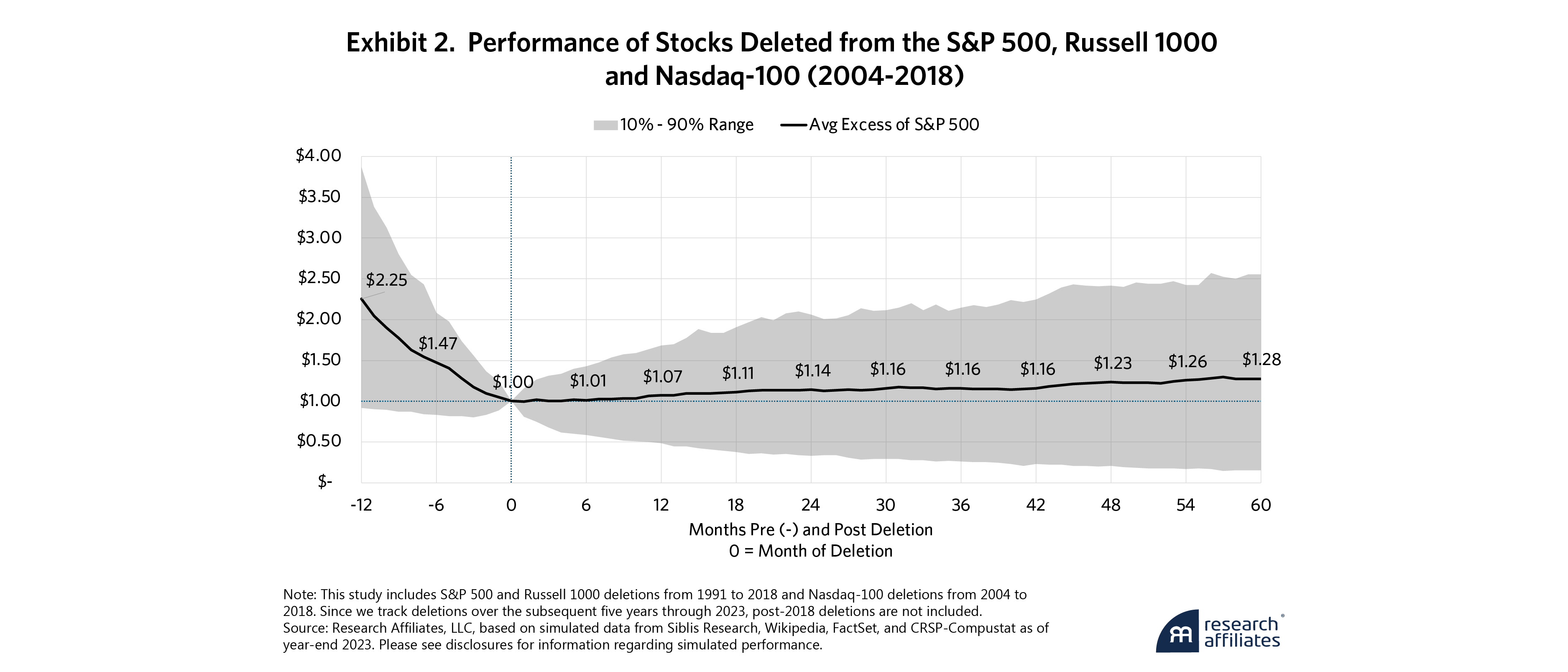Deletions lag the market by more than half in the year leading up to their removal from an index, but they historically outperform the market for at least five years after the breakup.