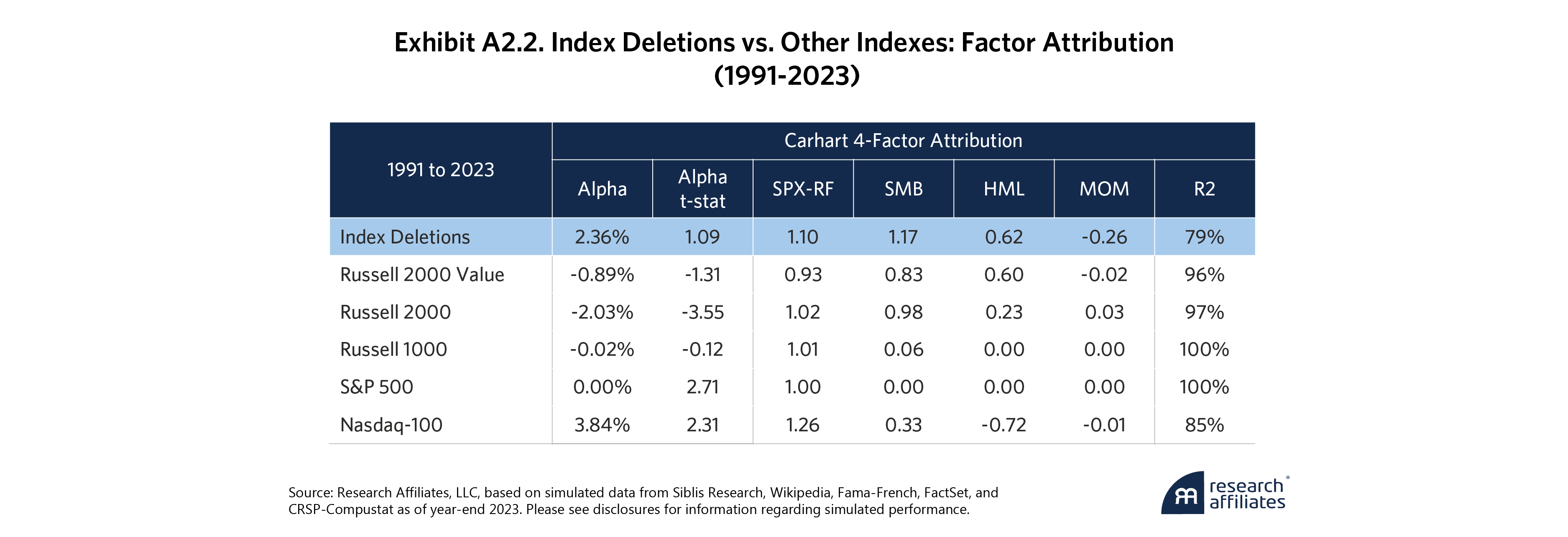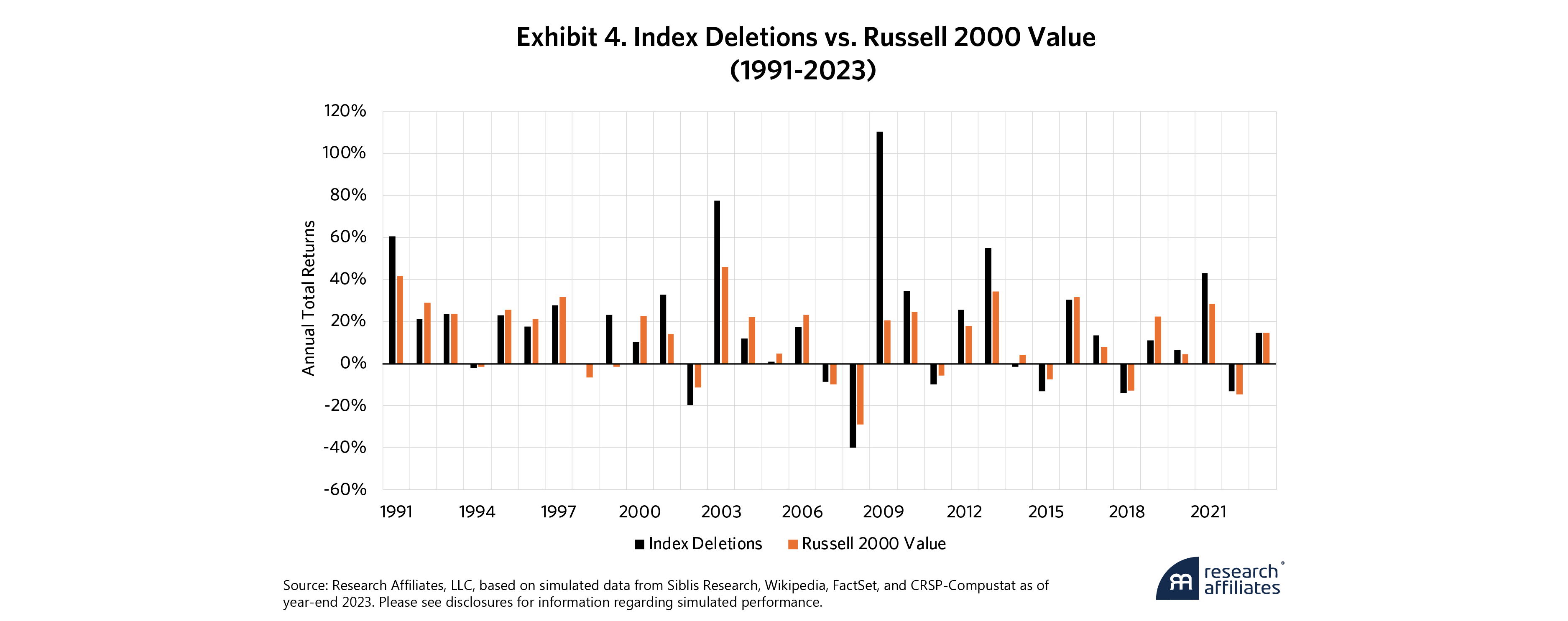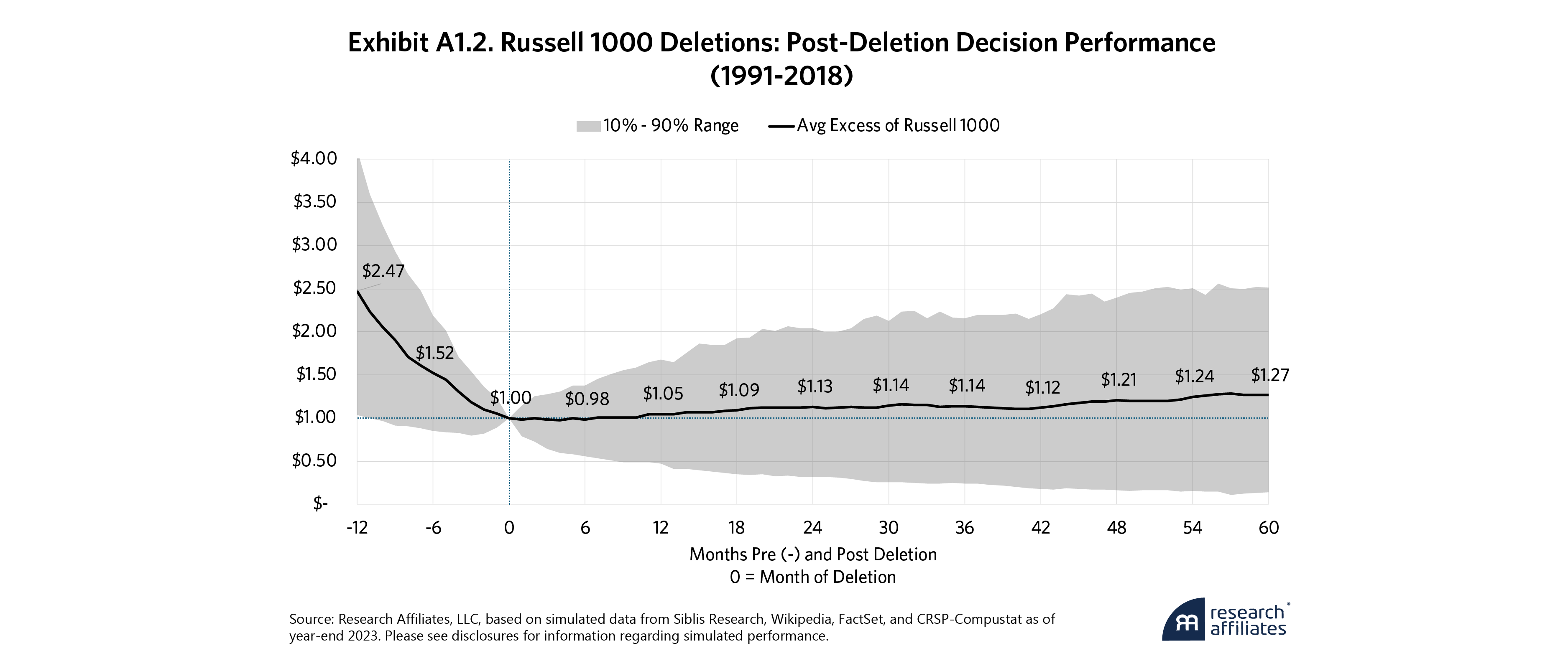 ”Not everybody recognizes this. We recently shared commentary, entitled “Imitation is the Sincerest Form of Flattery,” with our Research Affiliates Insights subscribers in response to analysis of the performance of index additions and deletions by Dimensional Fund Advisors7 and S&P.8 Their results support ours. But they use the S&P 500 as their benchmark. That is a mistake. How could deletions not lag the S&P 500 during the small-cap value rout of the last decade and the stunning ascent of the “Magnificent Seven” in 2023 and the first half of 2024? Since deletions are generally small- and mid-cap, and are almost always deep value stocks, the Russell 2000 Value is much more relevant, and deletions fared well compared to it during much of this difficult span. We can only imagine how they will perform should small-cap and value stocks stage a significant recovery, as we think is likely in the coming decade.