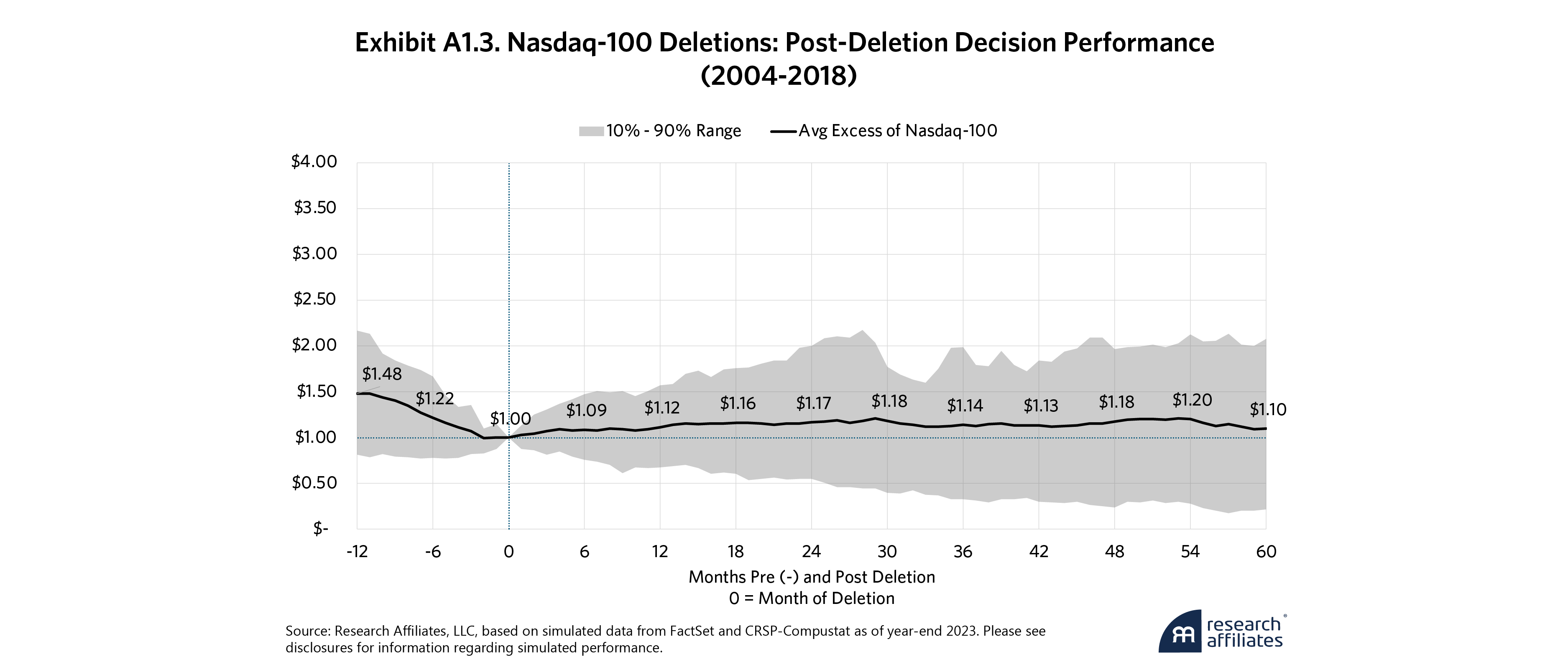 Such intriguing results have inspired us to take these investigations further and test these hypotheses in the real world. Today’s launch of the Research Affiliates Deletions Index (NIXT) is the first step in that direction. The NIXT index buys deletions from top 500 and top 1,000 market-cap weighted indexes, holds them for five years, and rebalances them annually to equal weight. This empirically has substantial overlap with the Russell 1000 and S&P 500 deletions and with very similar results. For the past 30 years, stocks have rebounded well after being dumped by an index. We’re looking forward to seeing if they maintain that resilience in the decades ahead.