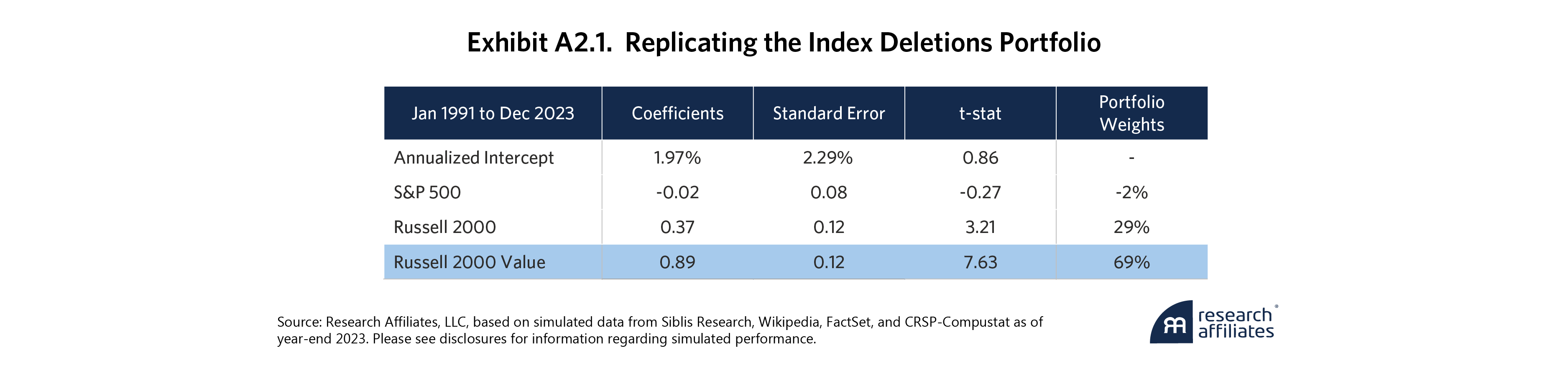 6. Regression analysis indicates this is the “correct” benchmark. Per Table A2.1, when we regress this deletions portfolio against the S&P 500, Russell 2000, and Russell 2000 Value, the majority weight (nearly 70%) is on the Russell 2000 Value. Nasdaq 100 deletions are a bit different. Since they are usually no longer S&P 500 members by the time they are dumped from the Nasdaq100, they are mid-cap value stocks. The Russell 2000 Value is still the better fit, however, because top 500 stocks dominate the Russell 1000 Value.