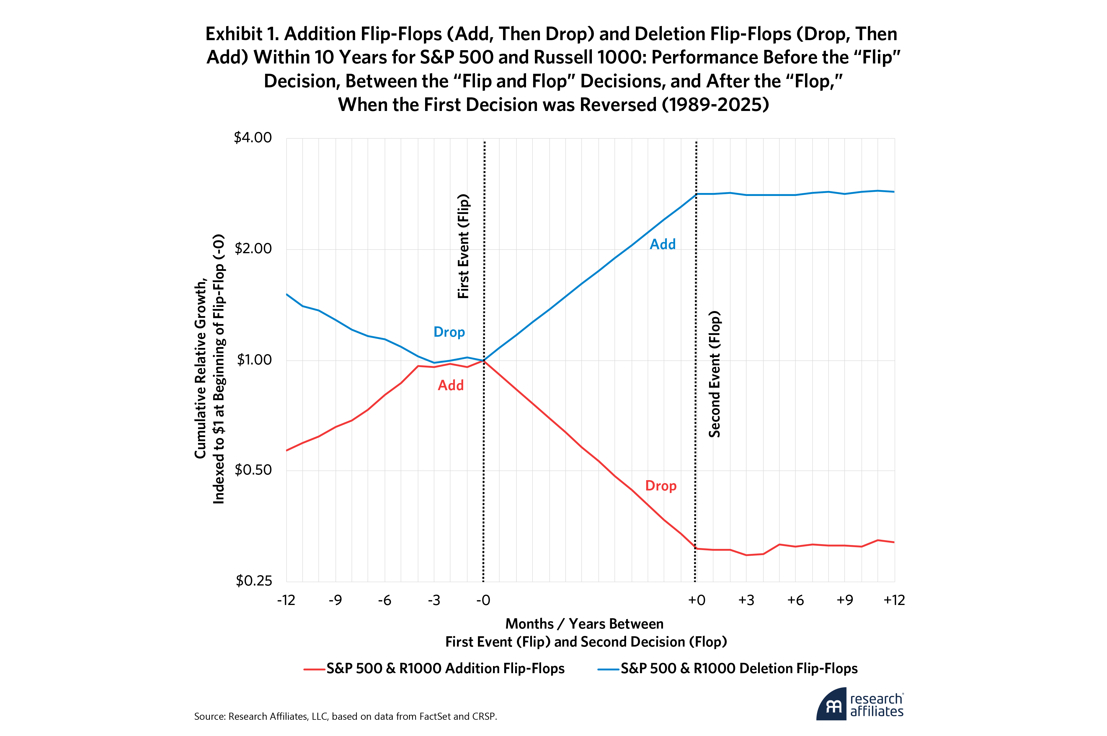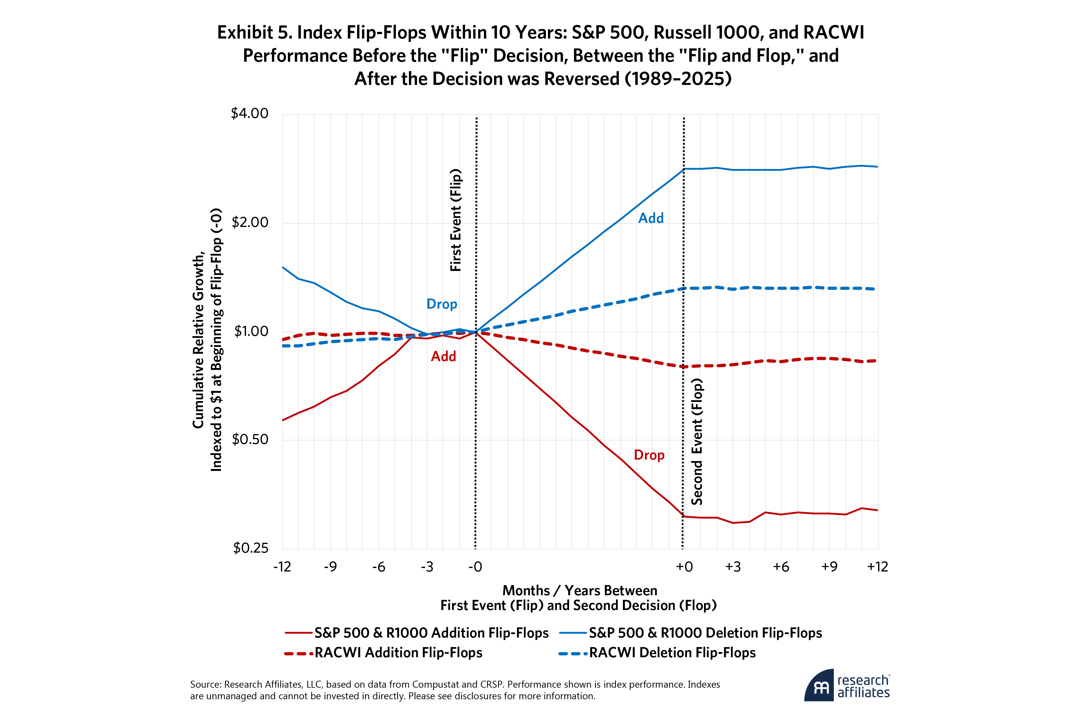 It’s no surprise that deletion flip-flops behave in the opposite fashion. Flip-flops aren’t the norm, but they are too common to ignore, especially given their horrific costs. We already know from our research that deletions generally outperform for the five years after they are dropped from the index, as we explained in our article “Nixed: The Upside of Getting Dumped,” which inspired our launch of the Research Affiliates Deletions Index in 2024. Flip-flops hurt investors three times, with stocks added after they’ve already soared, dropped after they give it all back (and then some), and then modestly outperform after they are no longer in the index. The nearly 40% spread between the two types suggests that when the index turns over names quickly, it’s often catching names at their most extreme—chasing the hot new story or bailing at the bottom. Maybe it's reacting to hype or panic. Either way, the timing often seems to reflect where a stock has been, not where it is heading.