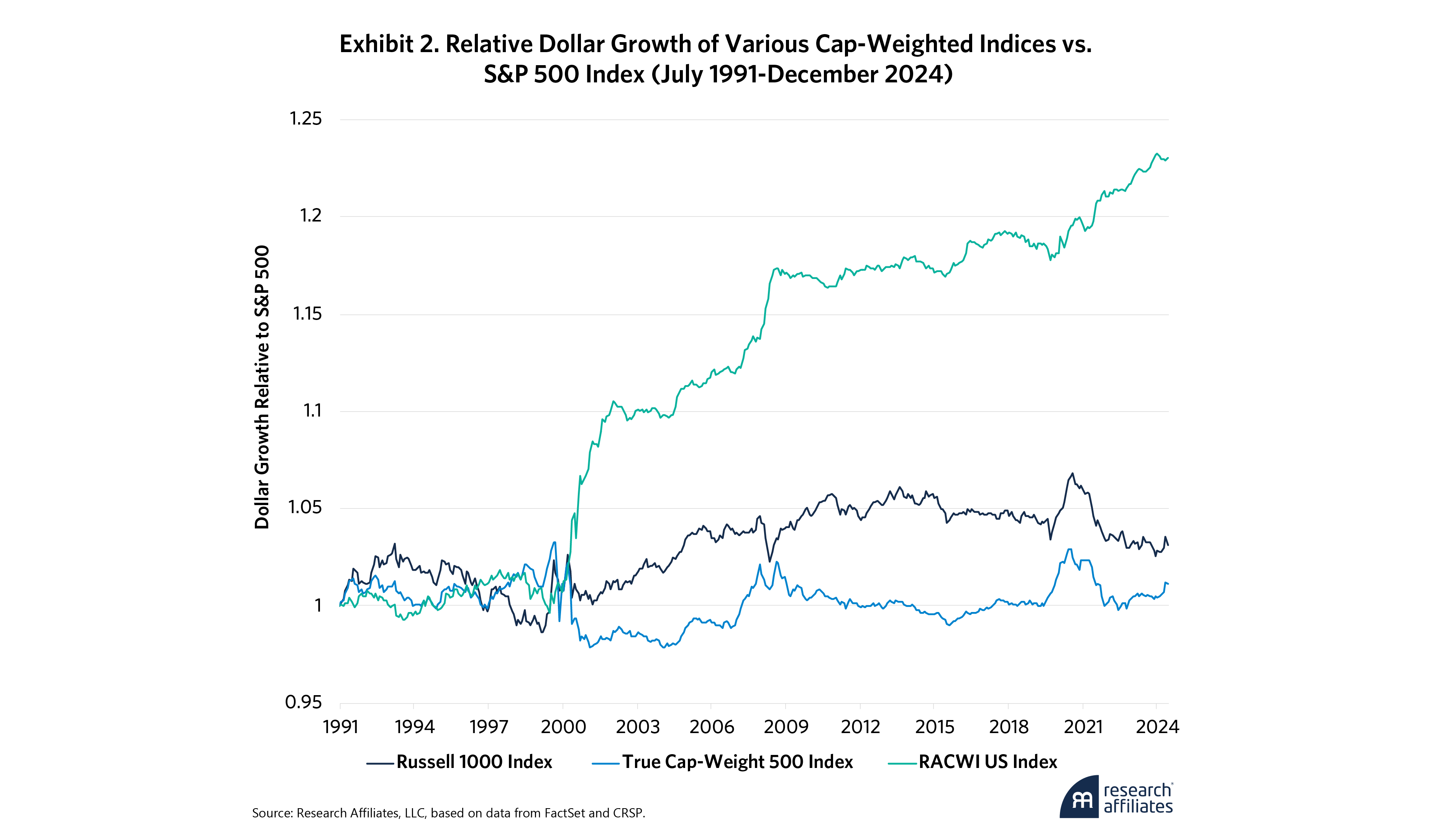The result? A fundamentally grounded broad-market cap-weighted index with better macroeconomic representation and better performance. Table 3 compares the performance of RACWI US with the leading cap-weighted indexes, S&P 500, and Russell 1000. We also include a True Cap Weight 500 (“True CW 500”), which is constructed by identifying the 500 largest-market-cap stocks domiciled in the US in March of each year and holding that portfolio for the following year.4 From July 1991 to the end of 2024, RACWI US beat S&P 500 by 69 bps per annum, with tracking error of just 0.90% relative to the S&P 500. This tracking error is actually lower than that observed for the Russell 1000, relative to the S&P 500.