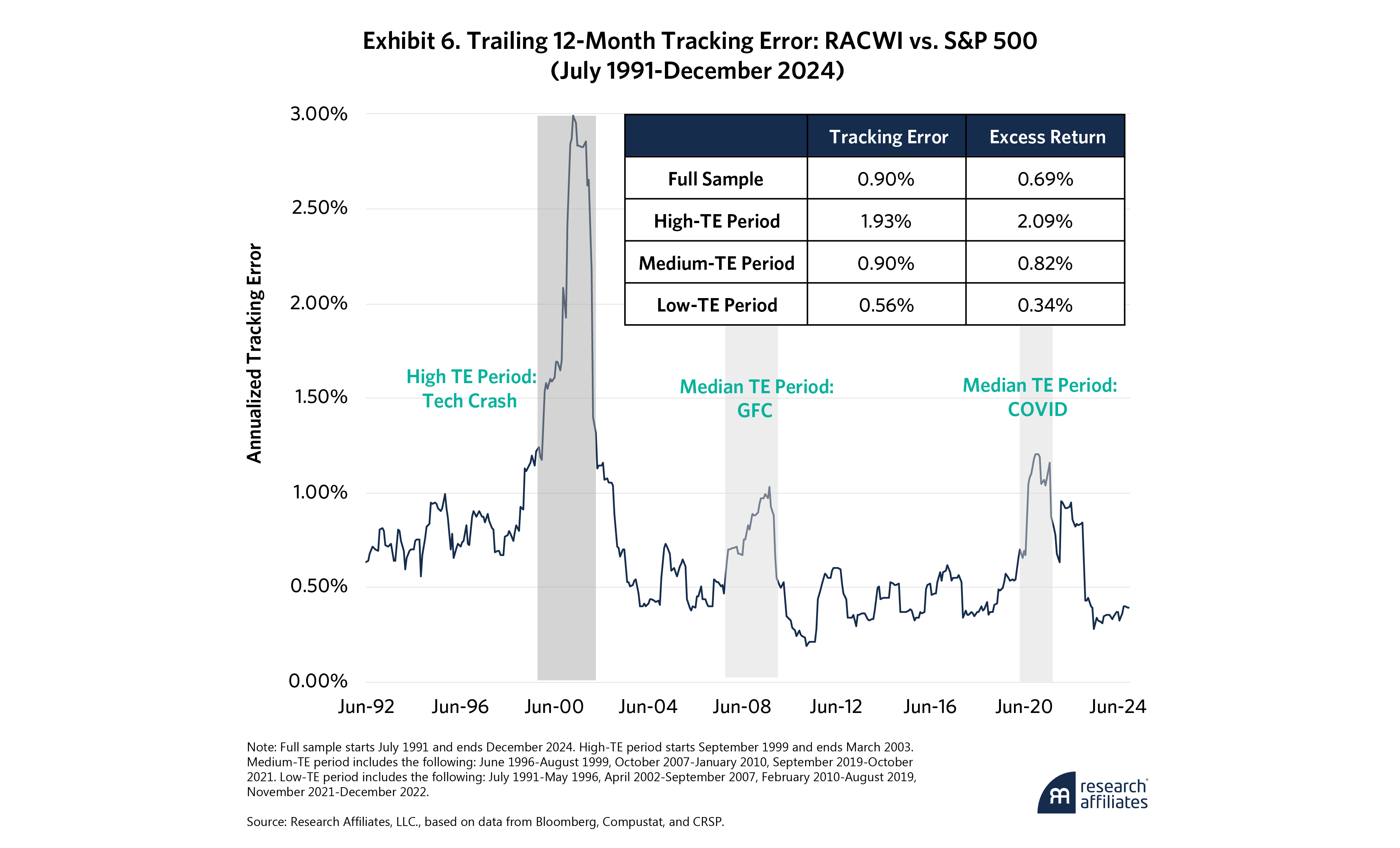 Exhibit 6 plots the trailing 12-month tracking error of RACWI US relative to the S&P 500 over more than three decades, along with a breakdown of RACWI’s excess return during different tracking-error regimes.
