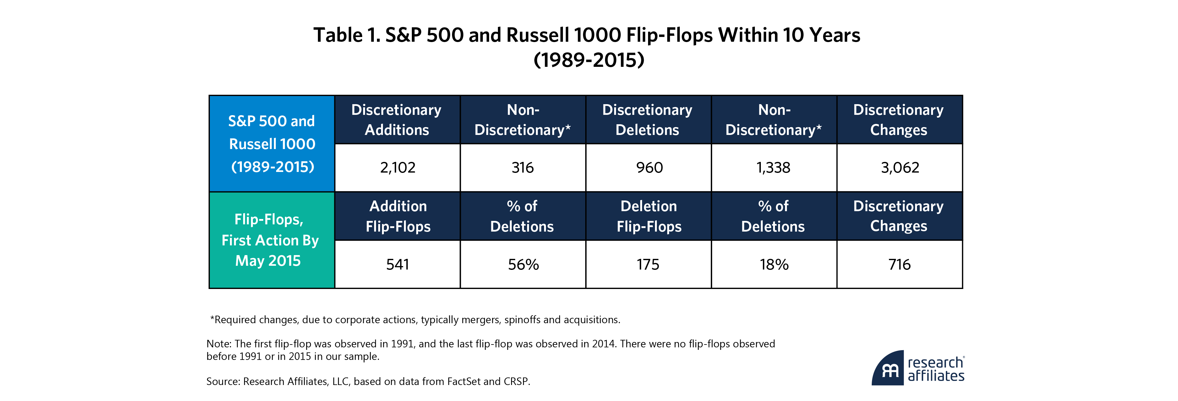 Turnover is a necessary feature of index maintenance, not a flaw. Markets evolve, companies change, and benchmarks must adapt. Sometimes, however, the index seems to reverse course: a stock is removed not long after it was added, or a name previously dropped finds its way back in. When this reversal happens in less than a decade, we call these addition flip-flops (add, then drop) and deletion flip-flops (drop, then add).