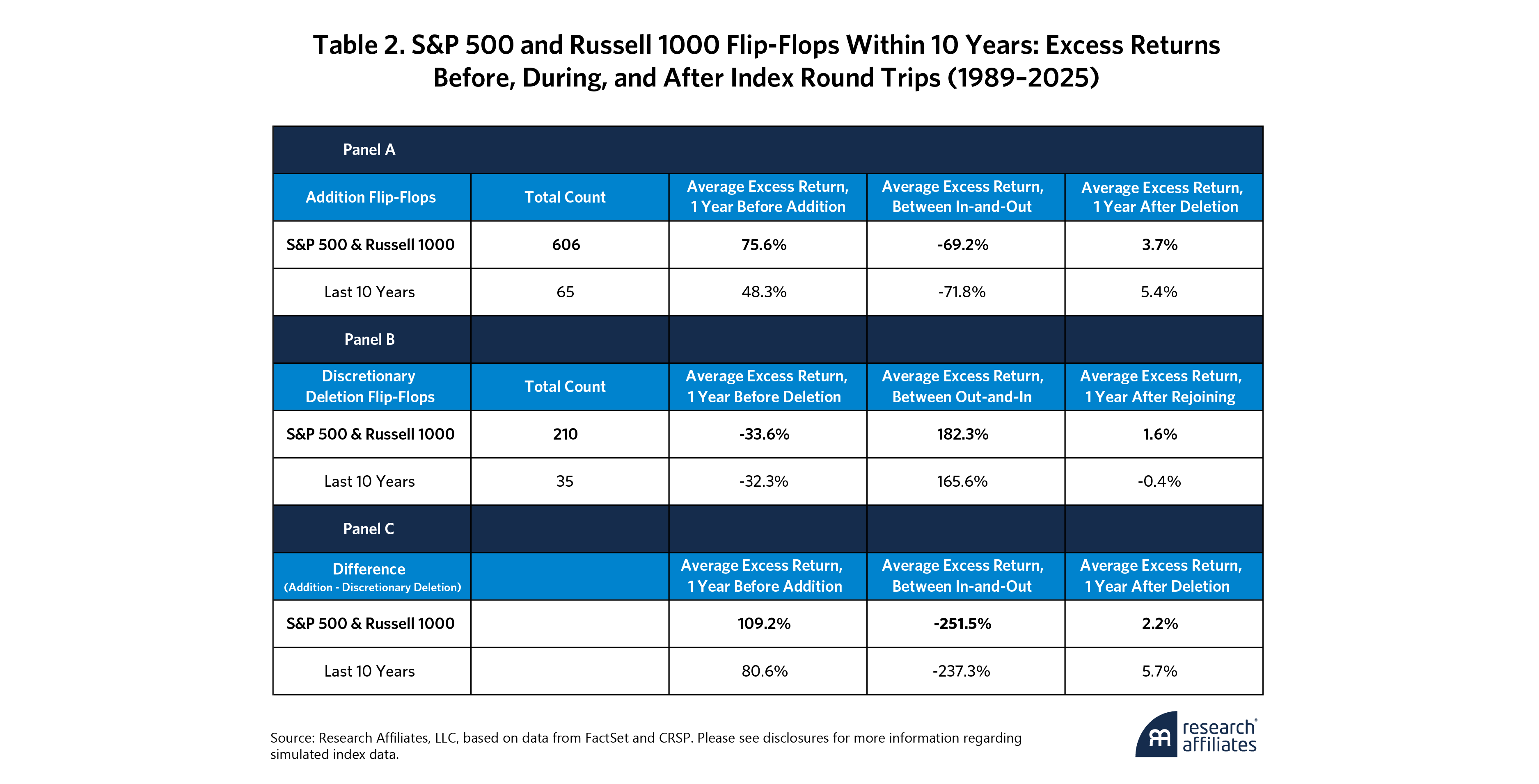 Table 2 puts hard numbers to the flip-flop story. Panel A shows that addition flip-flops are truly awful for index fund investors. First, they outperformed the market by a remarkable 75.6% in the year before their initial inclusion. Index funds missed out on this gain, and the gain played a starring role in the decision to add the stock to the index. Then they underperformed by 69.2% before they were kicked out. Indeed, that’s why they were deleted! Then, a year after being deleted, their average excess return was modestly positive, beating the market by an average of 3.7%, as we documented in our research on index deletions in (Arnott, Henslee, 2024).