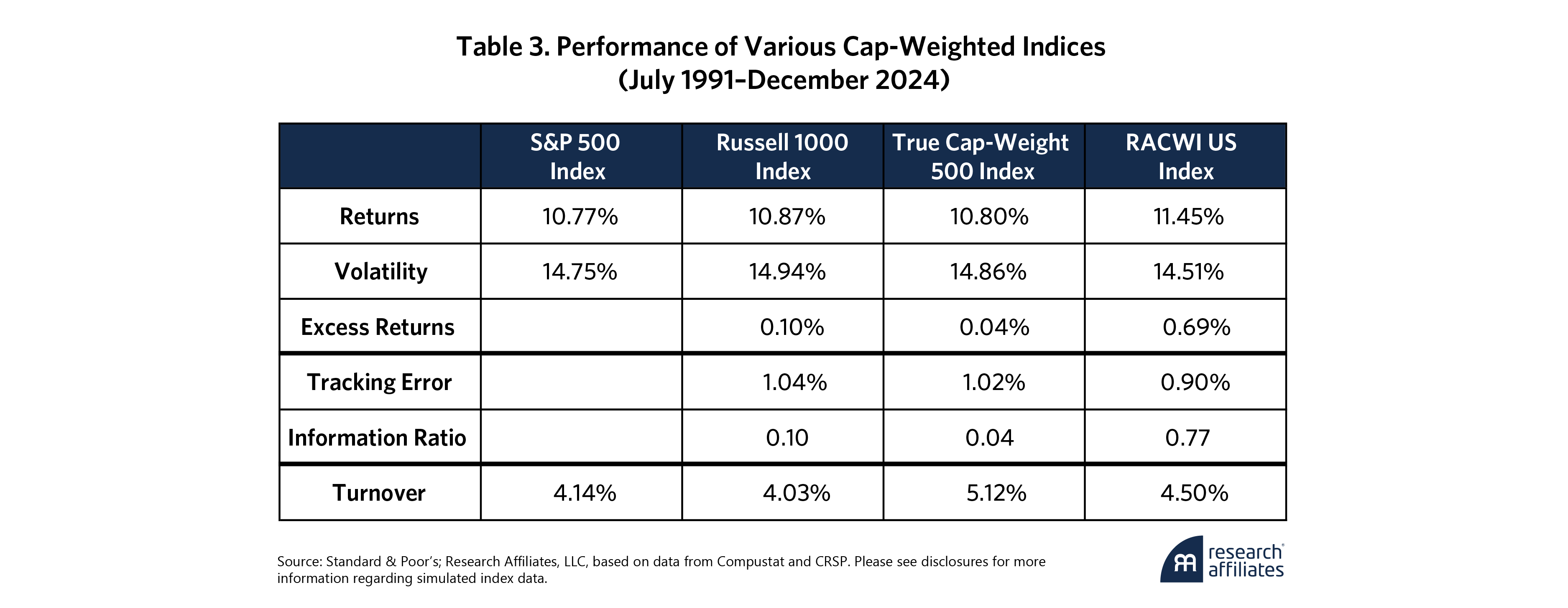It bears mention that the S&P 500, which many investors incorrectly assume holds the 500 largest-market-cap stocks, is managed by committee, not by formula. In that sense, it is an active strategy, not a passive index. That said, the committee does hold down turnover by not adding a stock just because its market cap has risen into the top 500. In fact, the purely formulaic True CW 500 has essentially the same return as the S&P 500, with 24% higher turnover and slightly higher risk.5 By contrast, RACWI has historically had essentially the same turnover as the S&P 500, with meaningfully higher returns and less risk.