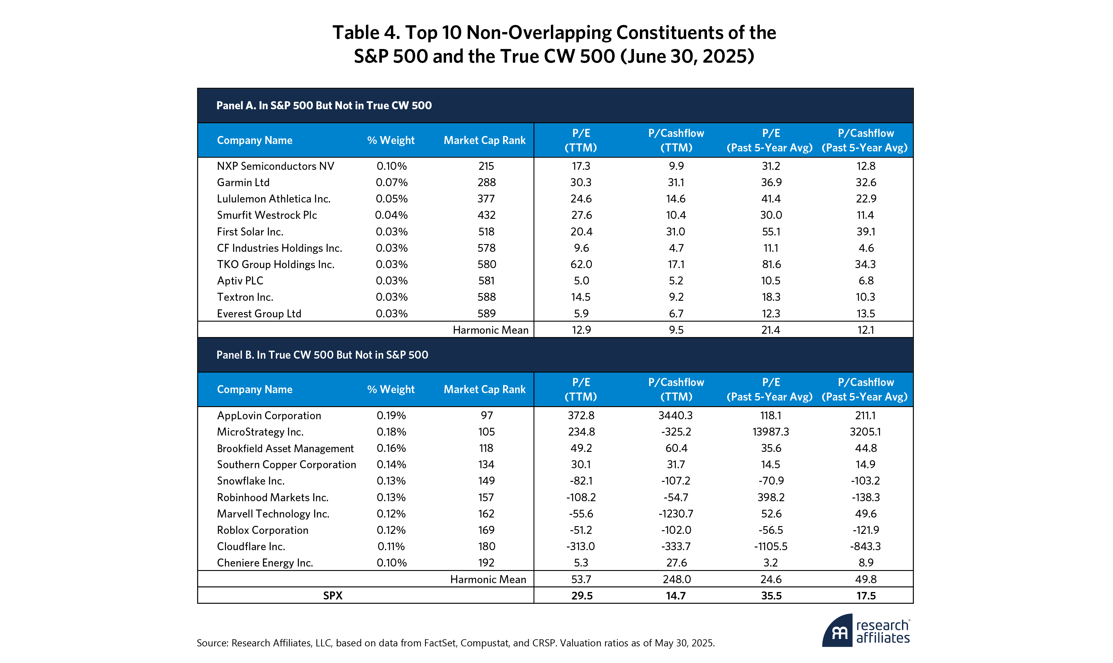 By contrast, Panel B lists the top ten stocks included in the True CW500 but excluded from the S&P 500. These tilt heavily toward speculative growth and aggressive valuations. Snowflake, Robinhood, Marvell Technology, Roblox, and Cloudflare are all large enough by market cap to qualify for the top 500 but show little consistent earnings power. Many report negative earnings or cashflow, which produces distorted multiples (even where earnings exist). The harmonic mean for this top 10 list comes to 53.7x earnings and 248.0x cashflow. Even when measured against five-year-average fundamentals, valuations remain stretched at 24.6x earnings and 49.8x cash flow.