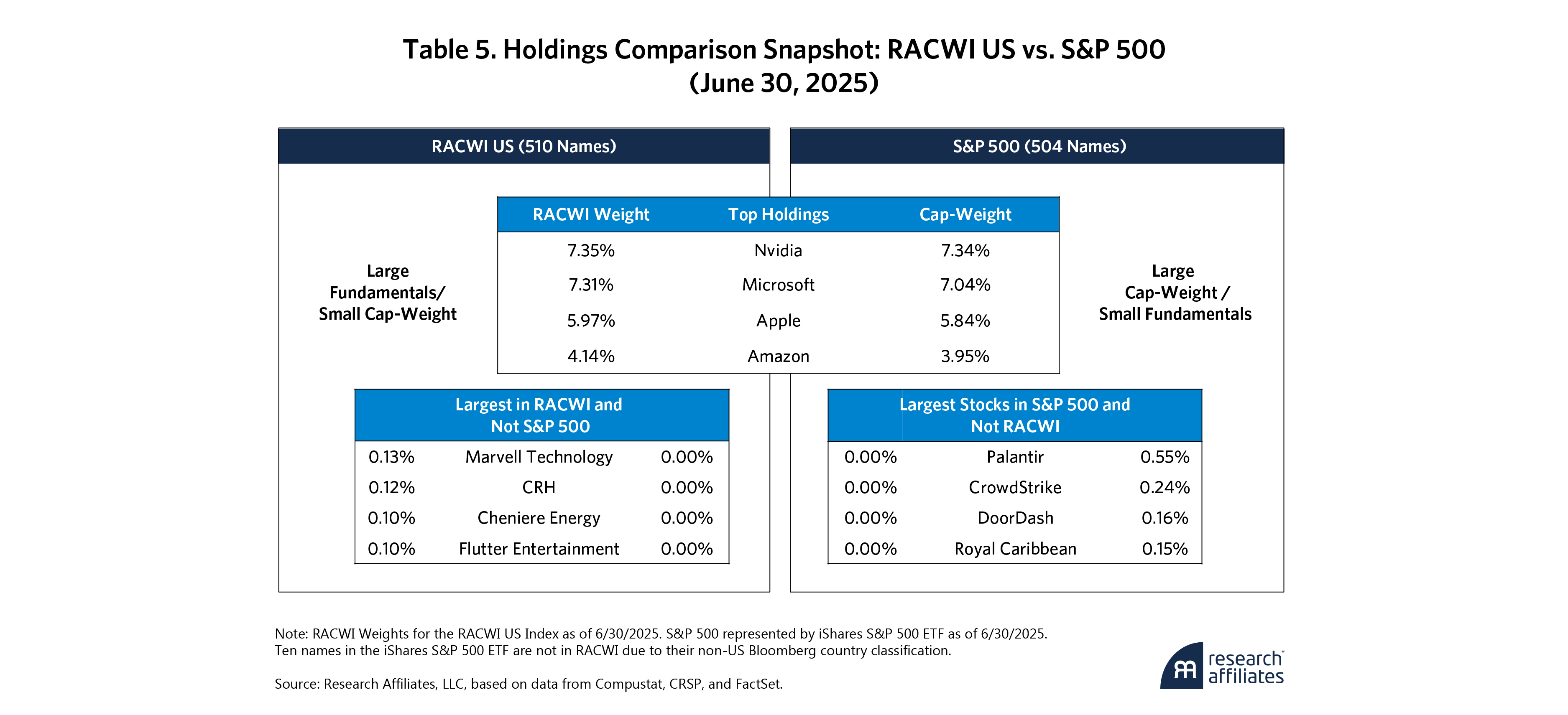 At first glance, RACWI and the S&P 500 look nearly identical: more than 95% of the value of the two portfolios overlaps, and those overlapping stocks are carried at essentially the same rank order and weights. The real differences lie only at the fringes, in two places: the handful of S&P names RACWI leaves out or the stocks S&P excludes but RACWI retains.