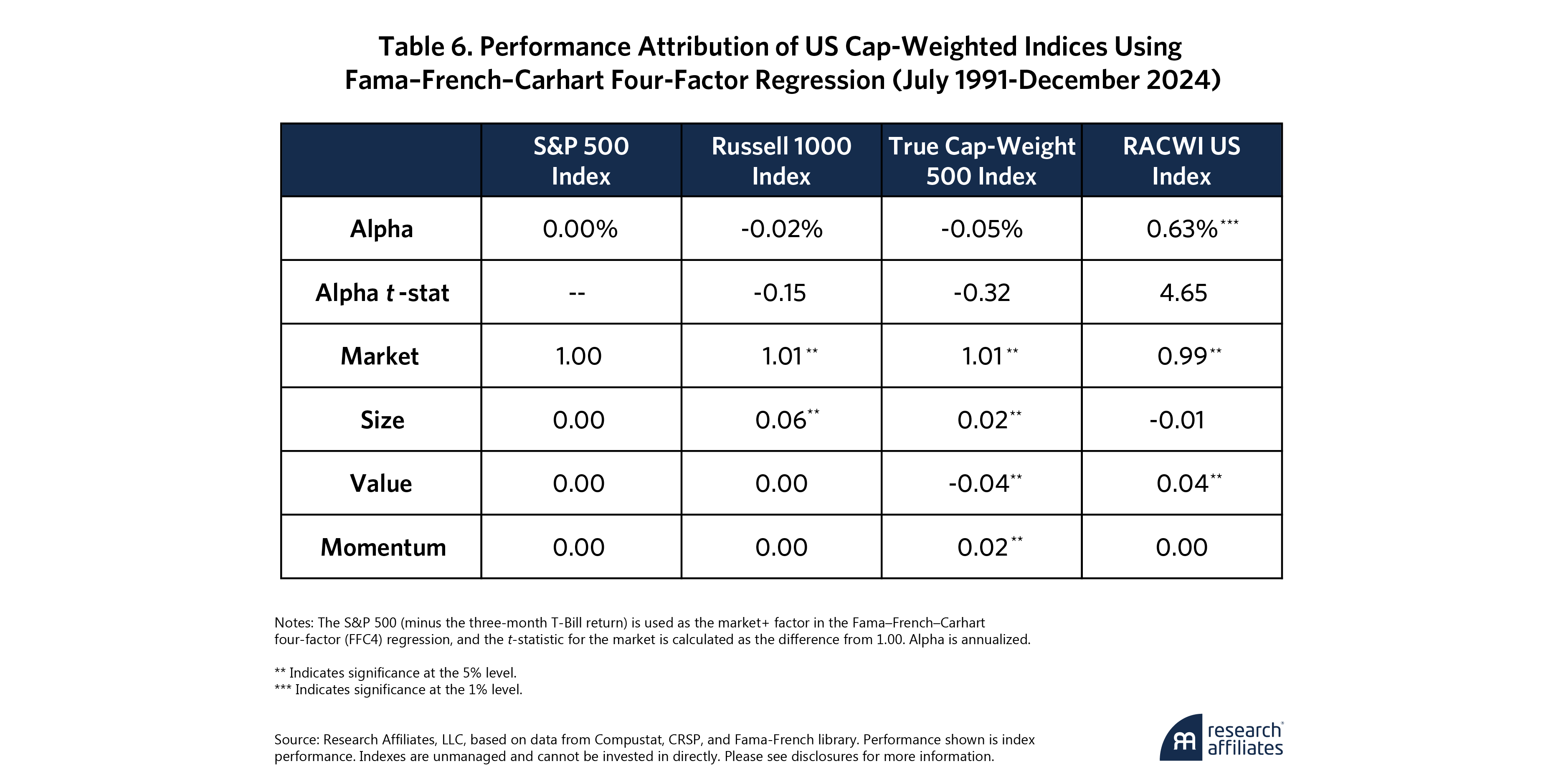 We found that all the indexes have market betas near 1.00, as one would expect, shown in Table 6. The Russell 1000 has a slight small-cap tilt thanks to its broader universe. True CW 500, built purely on market cap, has a noticeable lean towards growth and momentum when measured against the S&P 500. RACWI has a small, albeit significant, value tilt—no surprise, since it selects stocks based on fundamentals—and a perhaps-surprising large-cap tilt relative to the S&P 500 (then again, the S&P has almost 70 names that are not in the top 500 by market cap). But that’s not the whole story. Even after accounting for all style exposures, RACWI retains a risk-adjusted alpha of 63 bps per annum, with very powerful statistical significance.